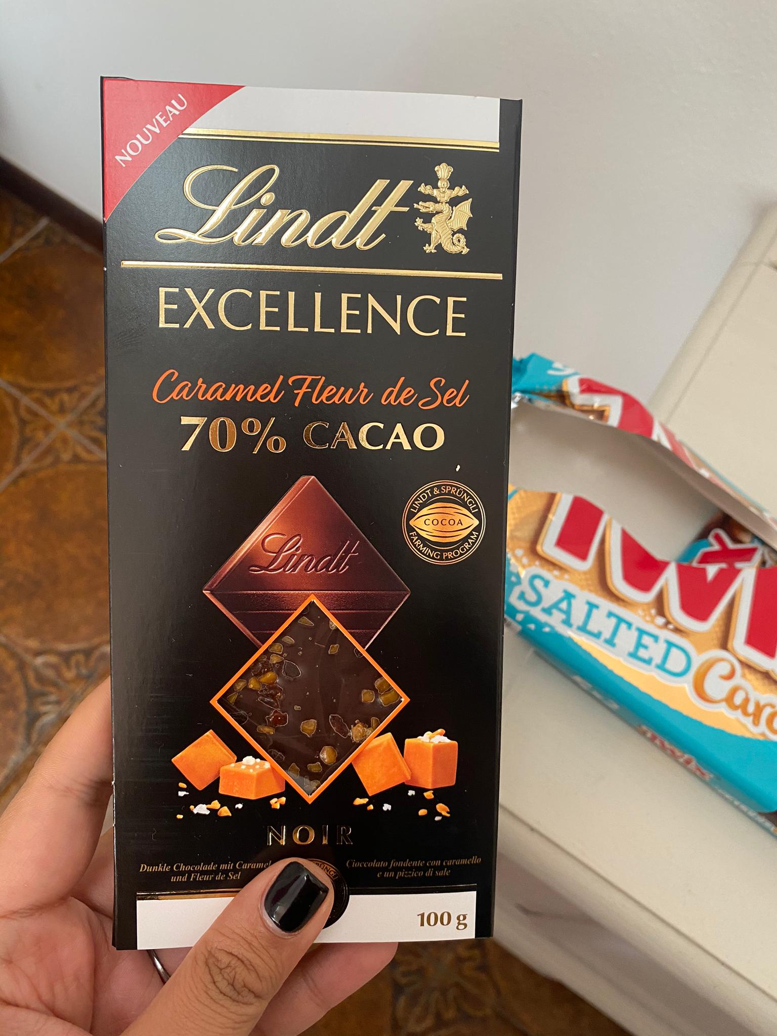 Il cioccolato fondente è sicuramente il mio preferito e questo sempre di Lindt con il sale è favoloso. Non è troppo forte il contrasto con il caramello (perché è salato, ovviamente) ed è molto equilibrato. Ha l’incredibile pregio di essere così buono che non mi fa venire voglia di mangiare tutta la tavoletta in un colpo, mangiarne un pezzetto soddisfa la mia voglia di qualcosa di buono senza farmi venir voglia di esagerare.
