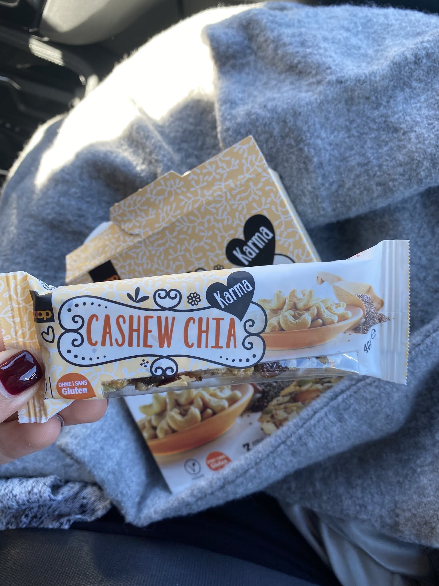 La linea Karma è la linea vegana di Coop svizzera e offre delle proposte fantastiche. Le barrette chia e anacardi non sono il massimo devo dire però, per i miei gusti un po’ troppo dolcina ma comunque buona. Il problema per me con le cose troppo dolci è che mi nauseano più che togliermi la fame. Non il massimo, ecco.