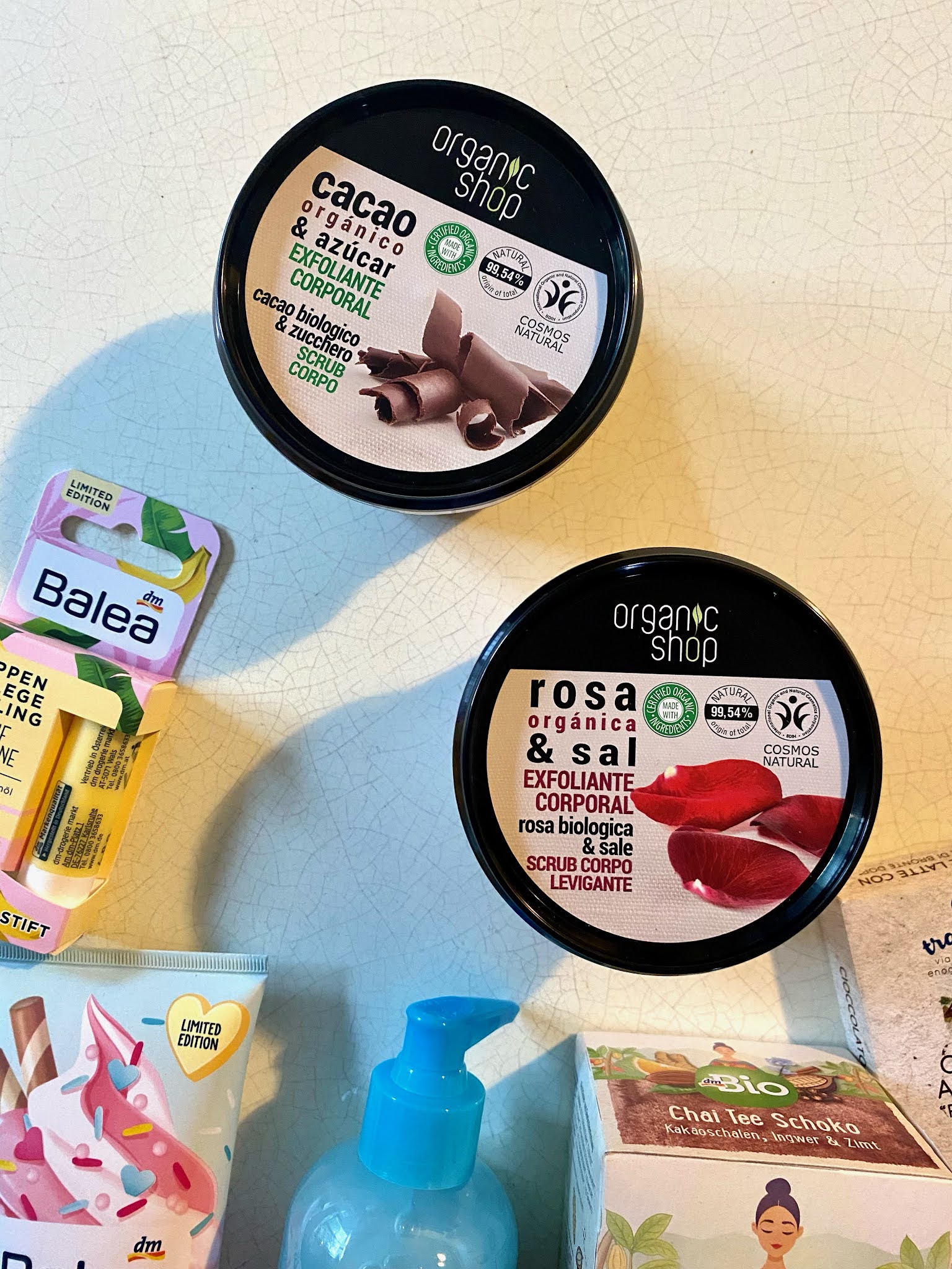 Da DM c’è Organic Shop, marchio bio che mi regala sempre grandi sorprese. Ho preso due scrub corpo -sto cercando di prendermi cura della mia pelle tutto l’anno e non solo d’estate come sarei onestamente molto molto tentata di fare- uno al cacao biologico e zucchero e l’altro alla rosa biologica e sale.