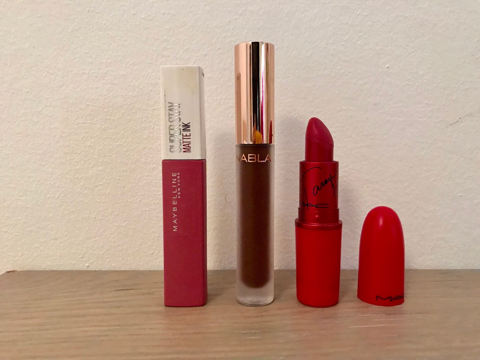 Tre prodotti labbra. Uno è il rossetto liquido Lover di Maybelline, una delle Super Stay Matte Ink.