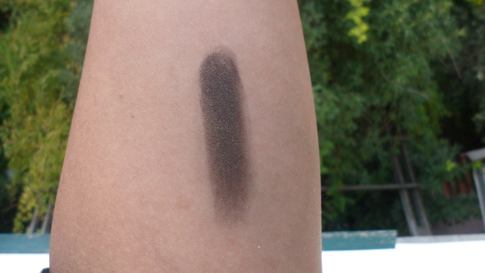 I really like this particular shade: is a greyish olive shade with gold shimmer. When you actually make a line with it the shimmers are not that visible. Used as creamshadow you can see the shimmer more.